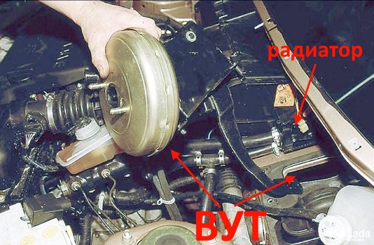 Есть другой способ его замены. Чтобы получить доступ к радиатору печки необходимо вместо корпуса отопителя снять вакуумный усилитель тормозов вместе с педалью тормоза. Это позволяет получить доступ к левой части отопителя (по ходу движения) и к самому радиатору.