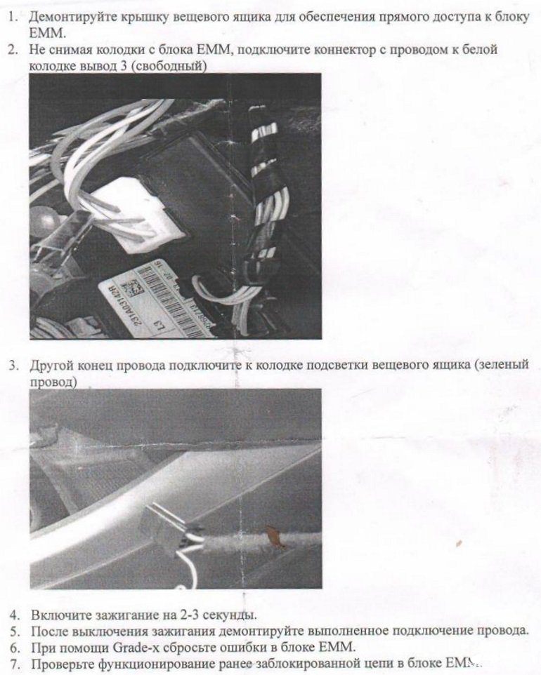 В некоторых случаях в результате короткого замыкания в дополнительном блоке кузовной электроники перегорают один или два канала (не работают габариты только с одной стороны, либо они не горят вообще). Восстановить работу блока EMM можно при помощи обычного реле, подключив его снаружи дополнительно блока кузовной электроники (прямо к проводам с разъемов этого блока):